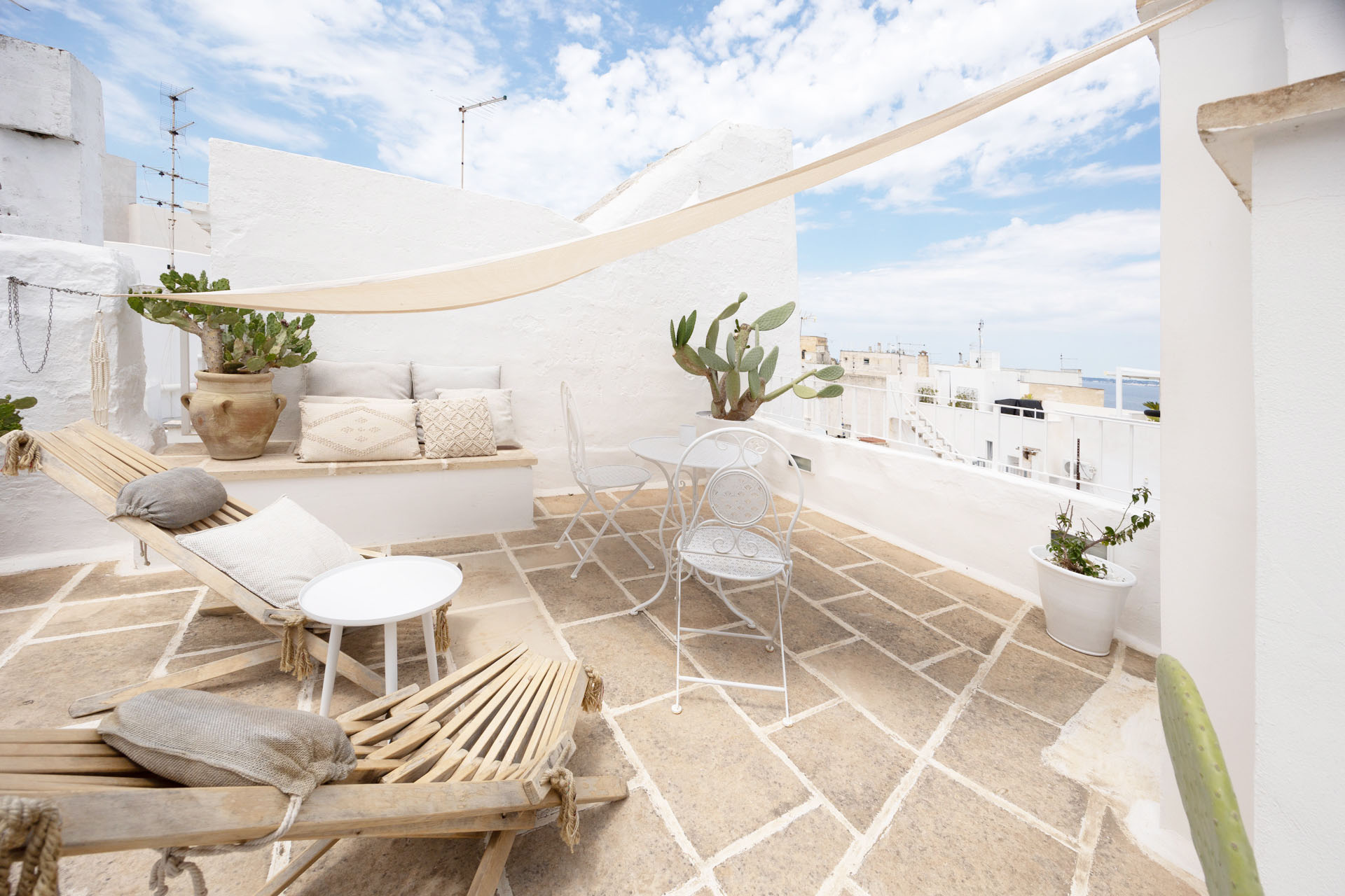Blanco è una camera matrimoniale all’interno del bed and breakfast Palmieri Luxury Rooms, nel centro storico di Gallipoli. Sita al secondo piano della struttura, la camera è dotata di aria condizionata, internet Wi-Fi, frigobar con freezer, bagno en suite con doccia, TV a schermo piatto ed un terrazzino di pertinenza esclusiva arredato con poltroncine.